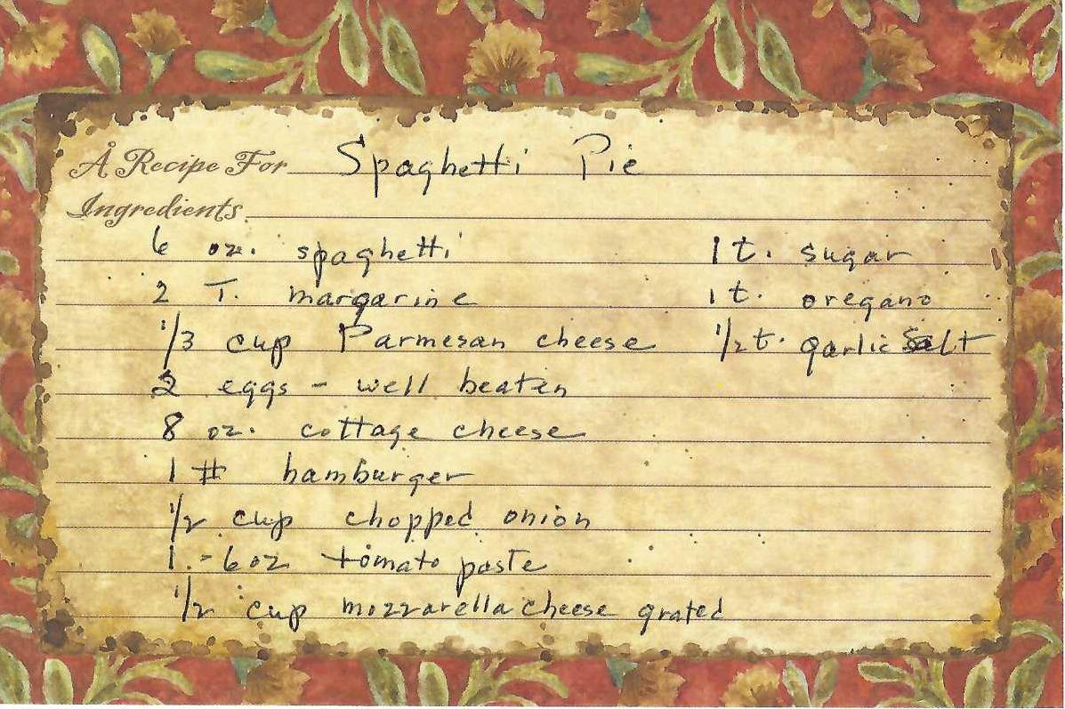 Cook spaghetti and drain. Stir margarine, beaten eggs and parmesan cheese with spaghetti. Form into "crust" in buttered 10" pie pan.