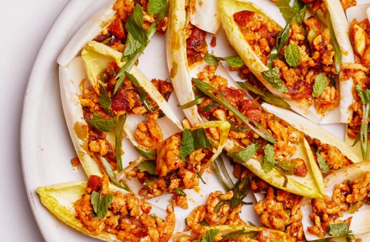 To serve, arrange endive on a large platter. Spoon chicken mixture over the endive and top with mint.