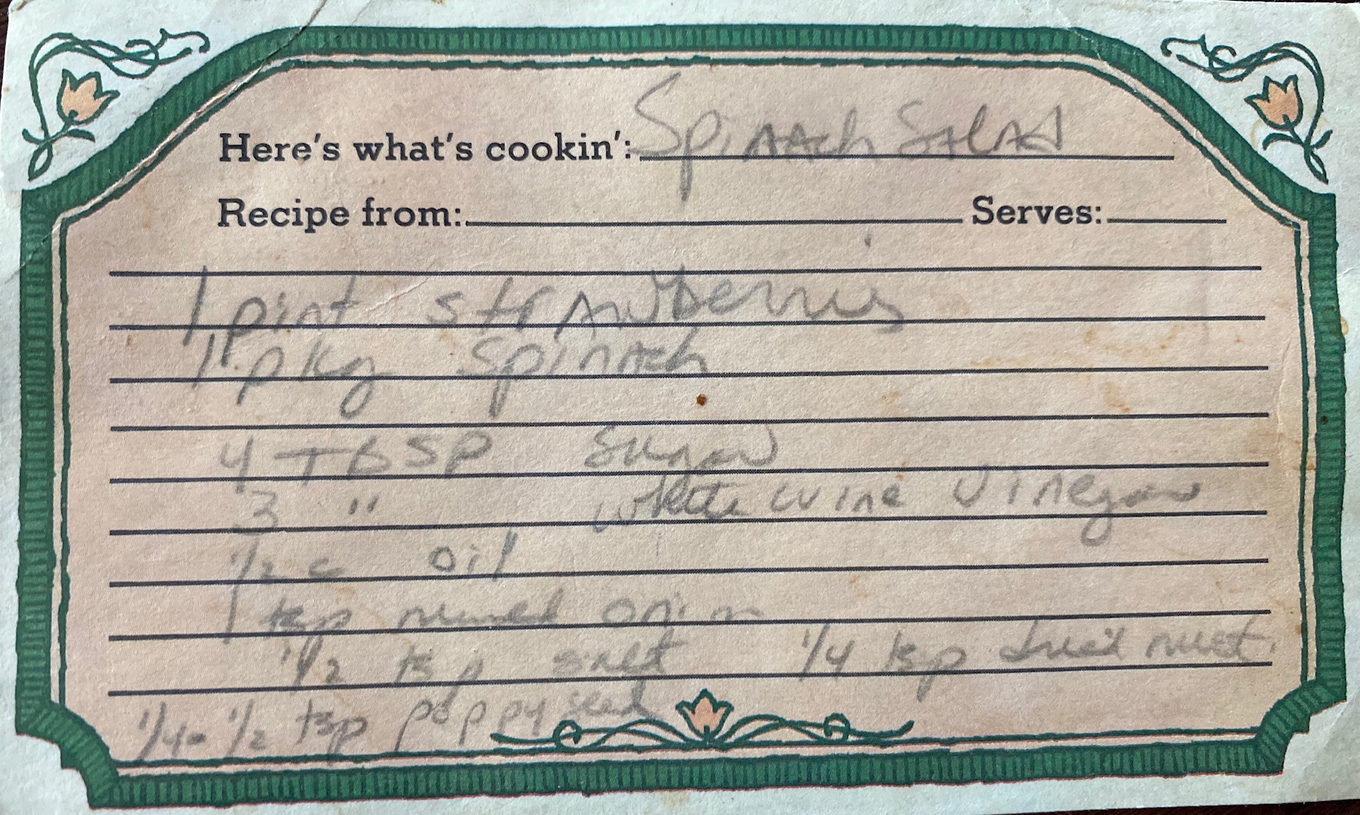 Spinach and strawberries tossed in poppy seed vinaigrette.