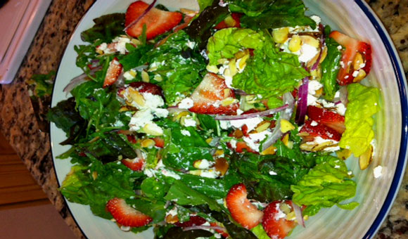 Leafy lettuce mixed with strawberries, red onions & goat cheese - delicious!