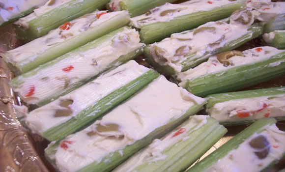 Chilled cheese and olive stuffing for celery sticks makes a great party tray.