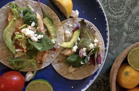 Split up tilapia fillets into smaller pieces and place on corn tortillas, topping with slaw, queso fresco, avocado slices, and a squeeze of lemon (along with any other hot sauce or toppings you prefer).