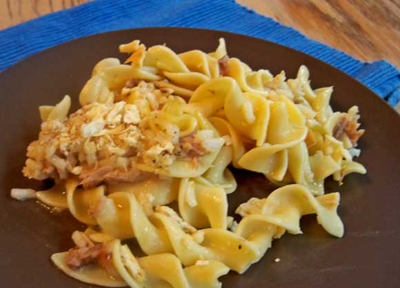 Pour into lightly greased casserole dish. Spoon can of tuna over noodles. Pour chicken with rice soup over top.
