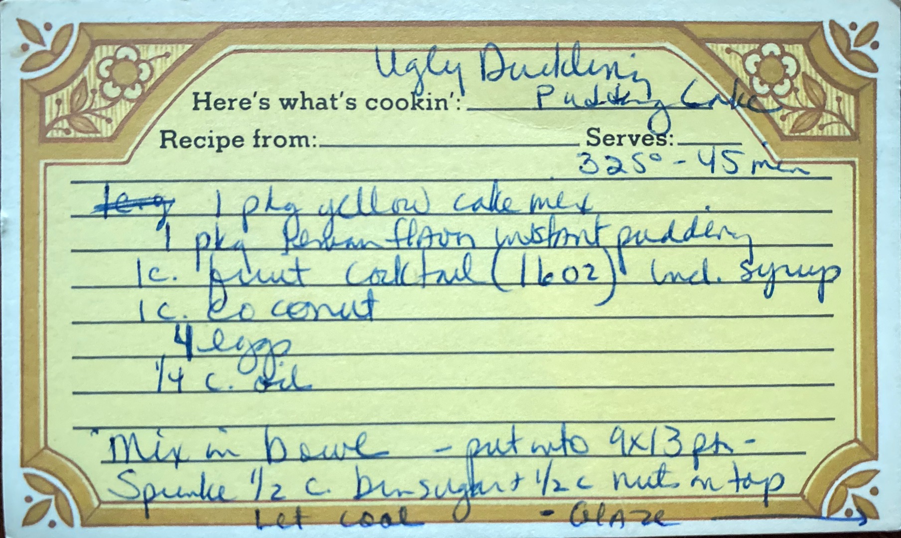 Yellow cake mix, lemon pudding, fruit cocktail, and coconut cake served with coconut glaze.