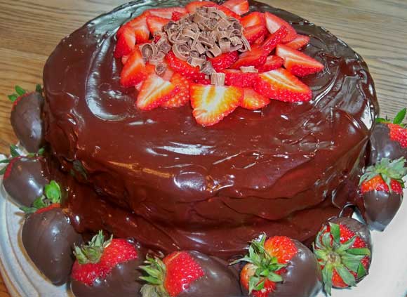 Alternating light and dark layers along with fresh strawberry garnishes make this cake a hit for any occasion.