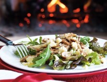 Sautéed mushrooms in white wine sauce served over winter greens with vinaigrette, aged cheddar and walnuts.