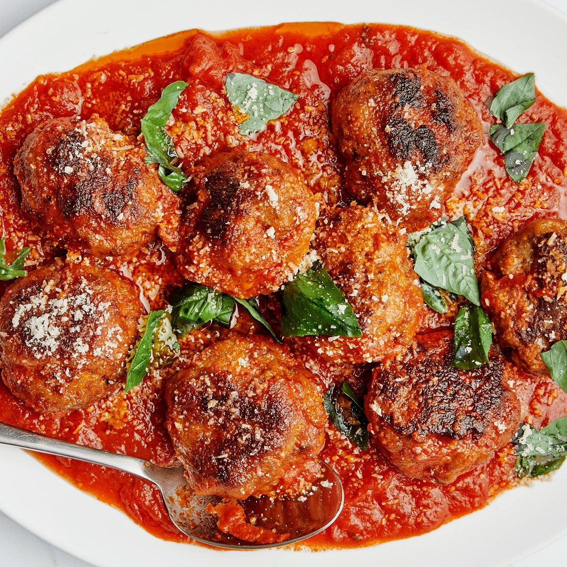 Divide meatballs among plates and spoon some sauce over. Top with basil and more Parmesan.