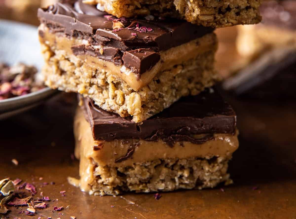 Oatmeal base cookie bars topped with peanut butter mixture and salted dark chocolate; from best friend Whitney.