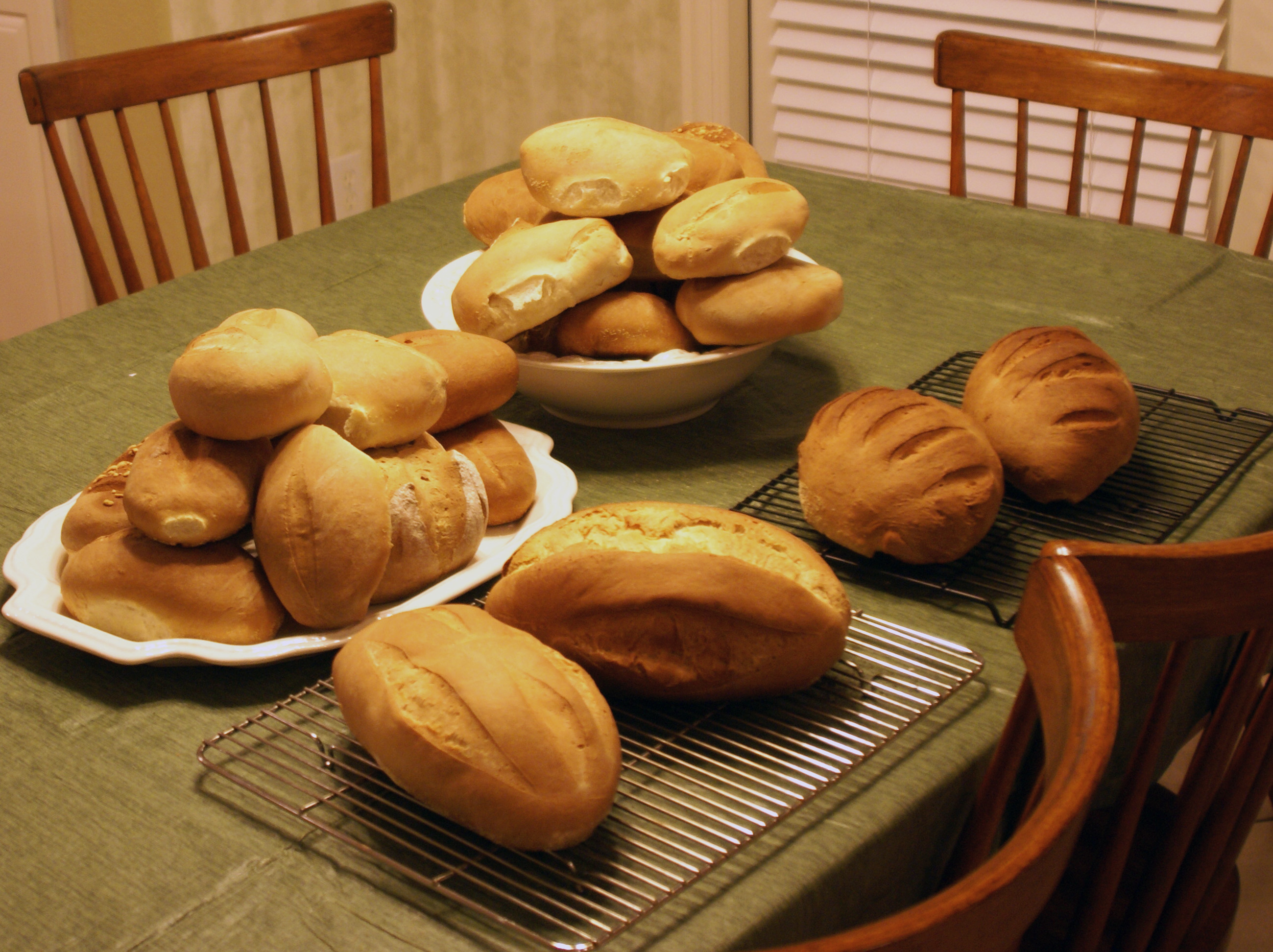 This basic recipe may be altered in many ways for variety. For example use 2-3 cups whole wheat flour instead of some of the white flour to make whole wheat bread. You can add herbs or spices. The loaves may be left as-is or rubbed with olive oil, butter, or water and egg white before rising to achieve various crust styles. This is a pretty generic bread recipe, but it originally called for "sponge" rather than active dry yeast. It can still be made that way but keeping a yeast/flour 'sponge' around takes a bit of doing
