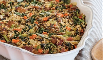 Sauté mushrooms and onion in butter until clear. Toss all other ingredients into sprayed casserole (2 quart) and add teaspoon of salt and cup of hot water and stir.